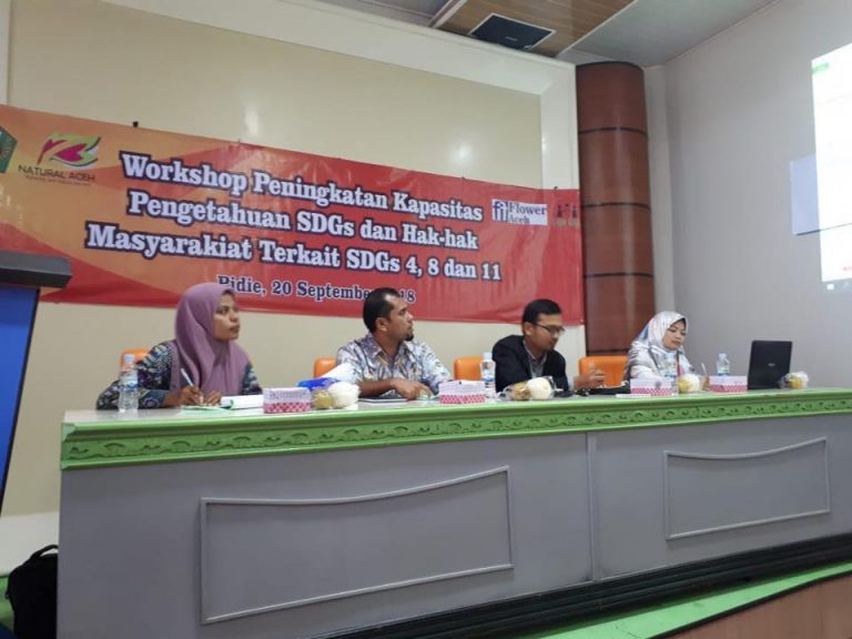 Workshop penguatan kapasitas tentang SDGs terkait tujuan SDGs 4, 8 dan 11. Memastikan pelaksanaan SDGs yang berprespektif gender, inklusif dan transformatif. “No one left behind”. Proses dipandu oleh Ernawati dengan menghadirkan Narasumber pemantik: Direktur Natural Aceh, Zainal “Hak-hak kelompok disabilitas dalam SDGs”, Bappeda Kabupaten Pidie, Faisal “Peran multipihak dalam pelaksanaan SDGs yang inklusif”, dan Direktur Flower Aceh, Riswati “Pemenuhan hak-hak Perempuan dalam platform SDGs”. Aula Bappeda Kabupaten Pidie, 20 September 2018. Natural Aceh, Flower Aceh dan FKM BKA (forum komunikasi masyarakat berkebutuhan khusus aceh). Foto by Zulfikar