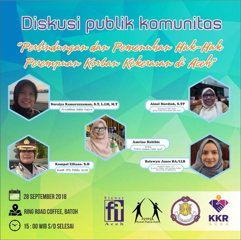 Diskusi Publik Komunitas “Pemberdayaan dan Pemenuhan Hak hak Perempuan Korban Kekerasan di Aceh”. Banda Aceh 28 September 2018. Diselenggarakan oleh Flower Aceh, Balai Syura, P2TP2A Rumoh Putroe