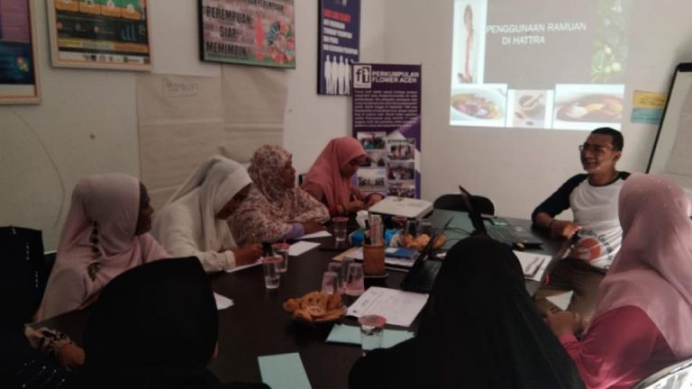 Diskusi kelompok Pembatra tentang proses pengurusan Izin produk, pengenalan dan Cara mengolah ramuan tanaman obat serta mekanisme koordinasi Pembatra dengan tenaga medis. Diskusi menghadirkan Kasie Keparmasian Dinas Kesehatan Kota Banda Aceh, Bapak Reza. Kantor Flower Aceh, 19 September 2018
