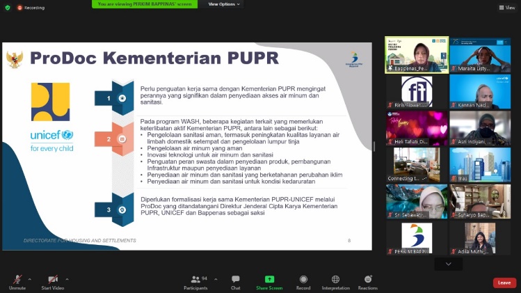 Rapat Review Tengah Tahun Program Kerjasama Pemerintah RI-UNICEF Outcome 2 (Air Minum, Sanitasi dan Hygiene/WASH). Rapat ini membahas tentang perkembangan pelaksanaan kegiatan Program Kerja Sama Pemerintah RI-UNICEF Tahun 2021 dan status pencapaian target sebagaimana tertuang dalam Annual Work Plan (AWP) 2021 Outcome 2: WASH. Kegiatan ini telah dilaksanakan pada hari Rabu, tanggal 4 Agustus 2021 yang diikuti oleh Direktur Flower Aceh.